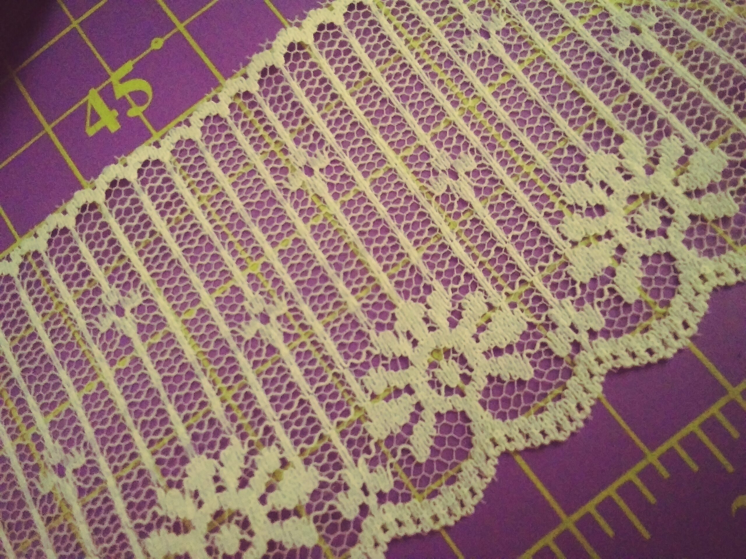 This is a nice, 2 1/2″ ivory floral scalloped lace with a 1 1/4″ pattern repeat.